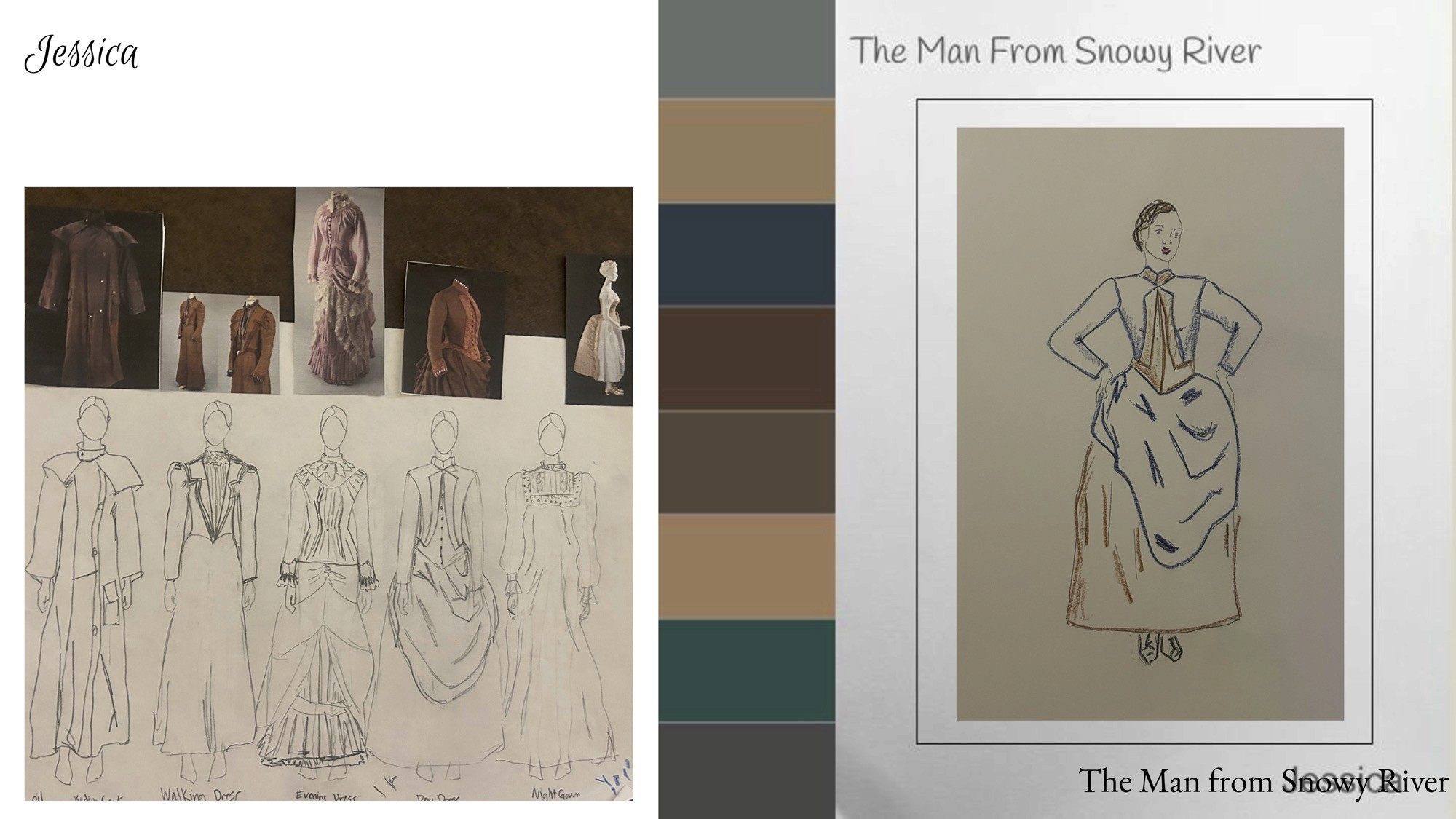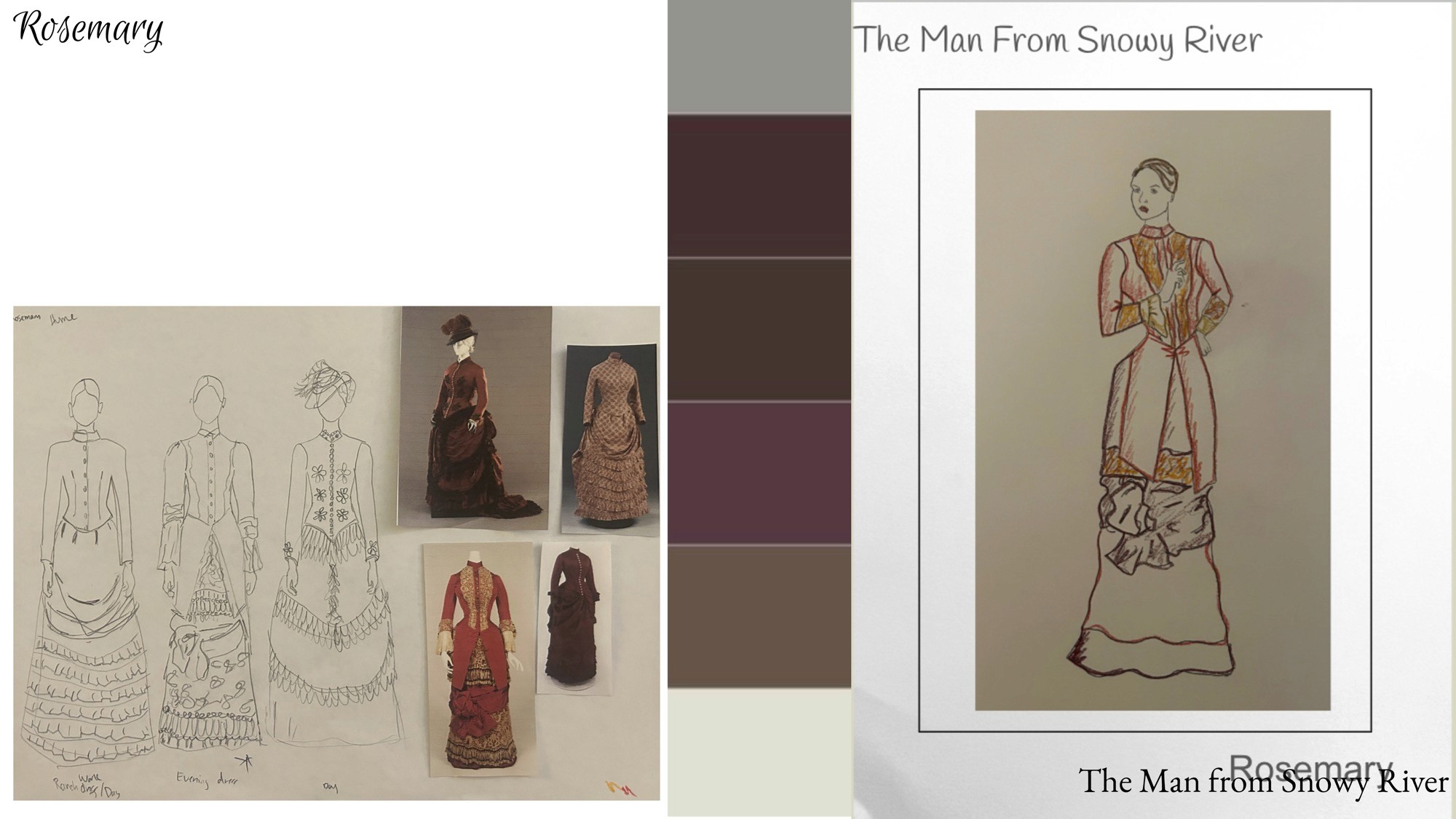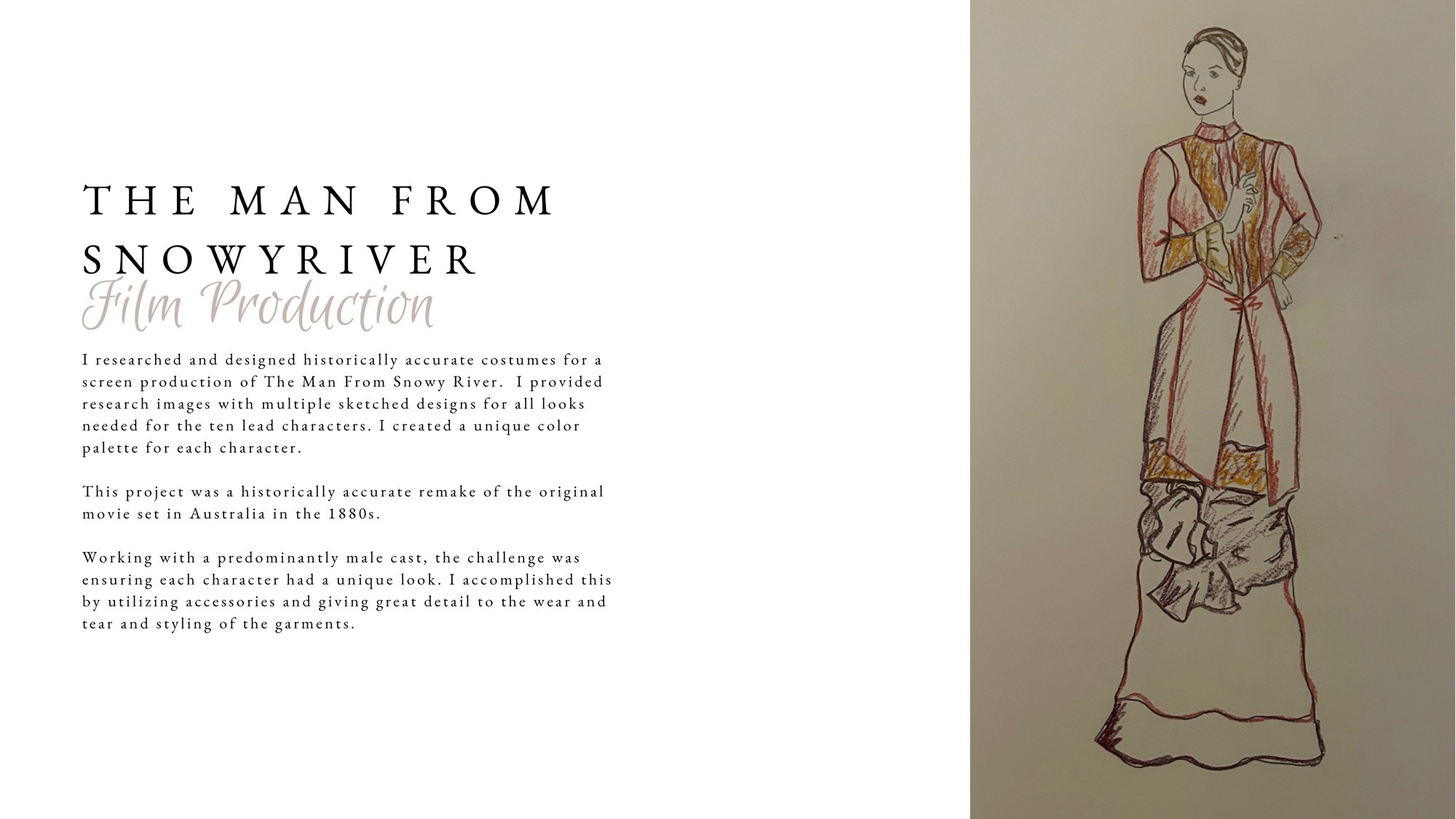 I researched and designed historically accurate costumes for a screen production of The Man From Snowy River. I provided research images with multiple sketched designs for all looks needed for the ten lead characters. I created a unique color palette for each character.
