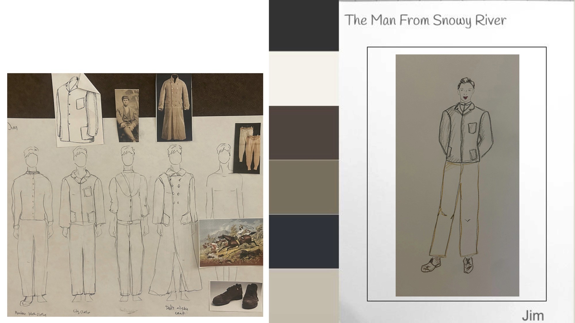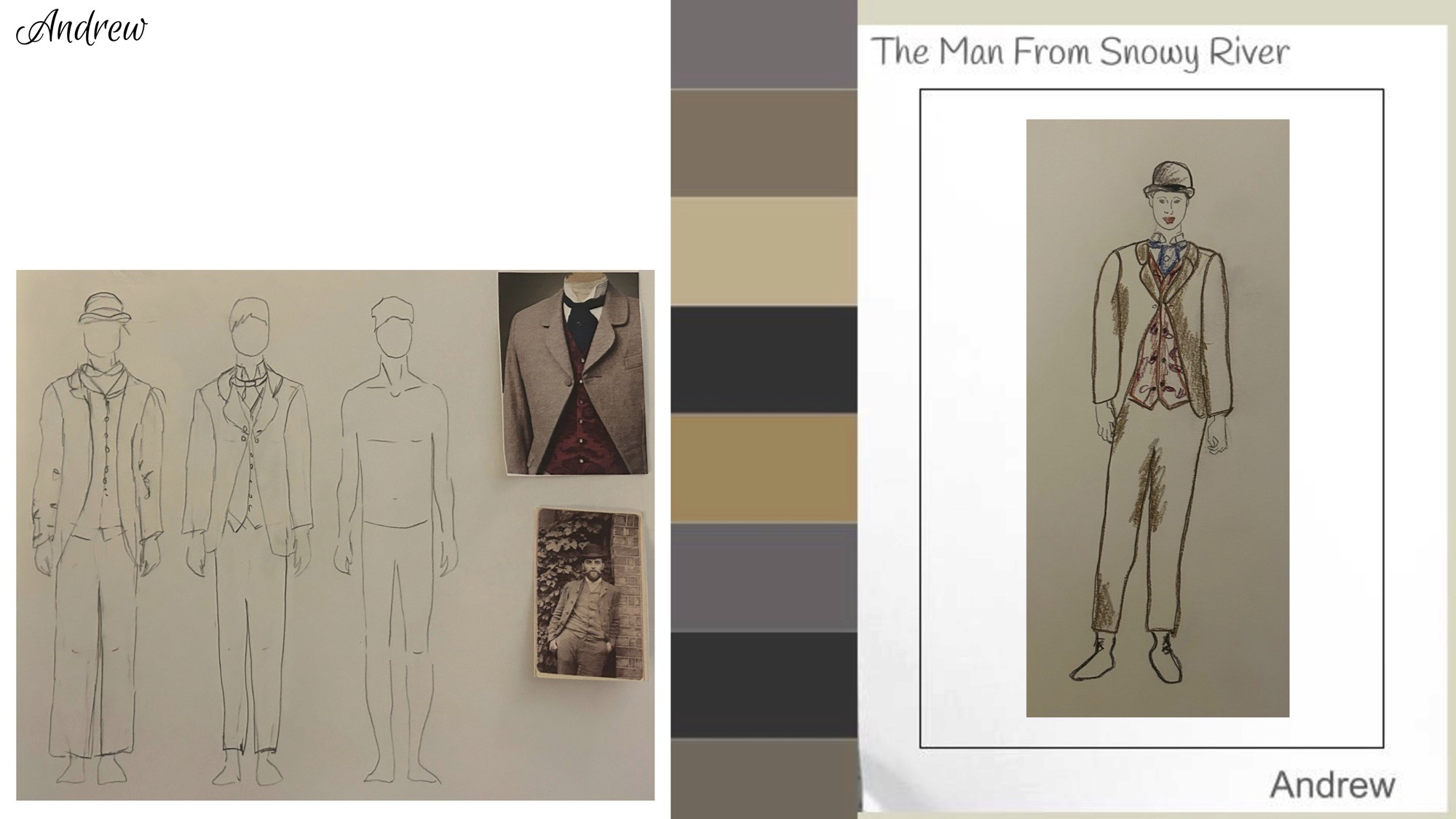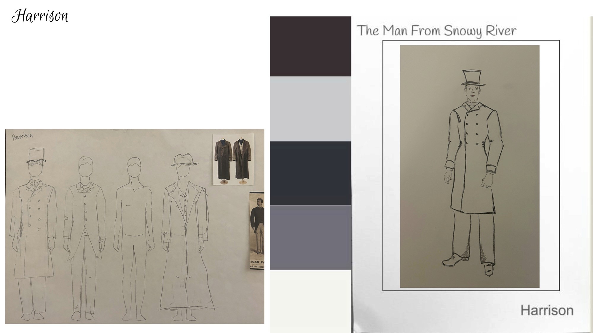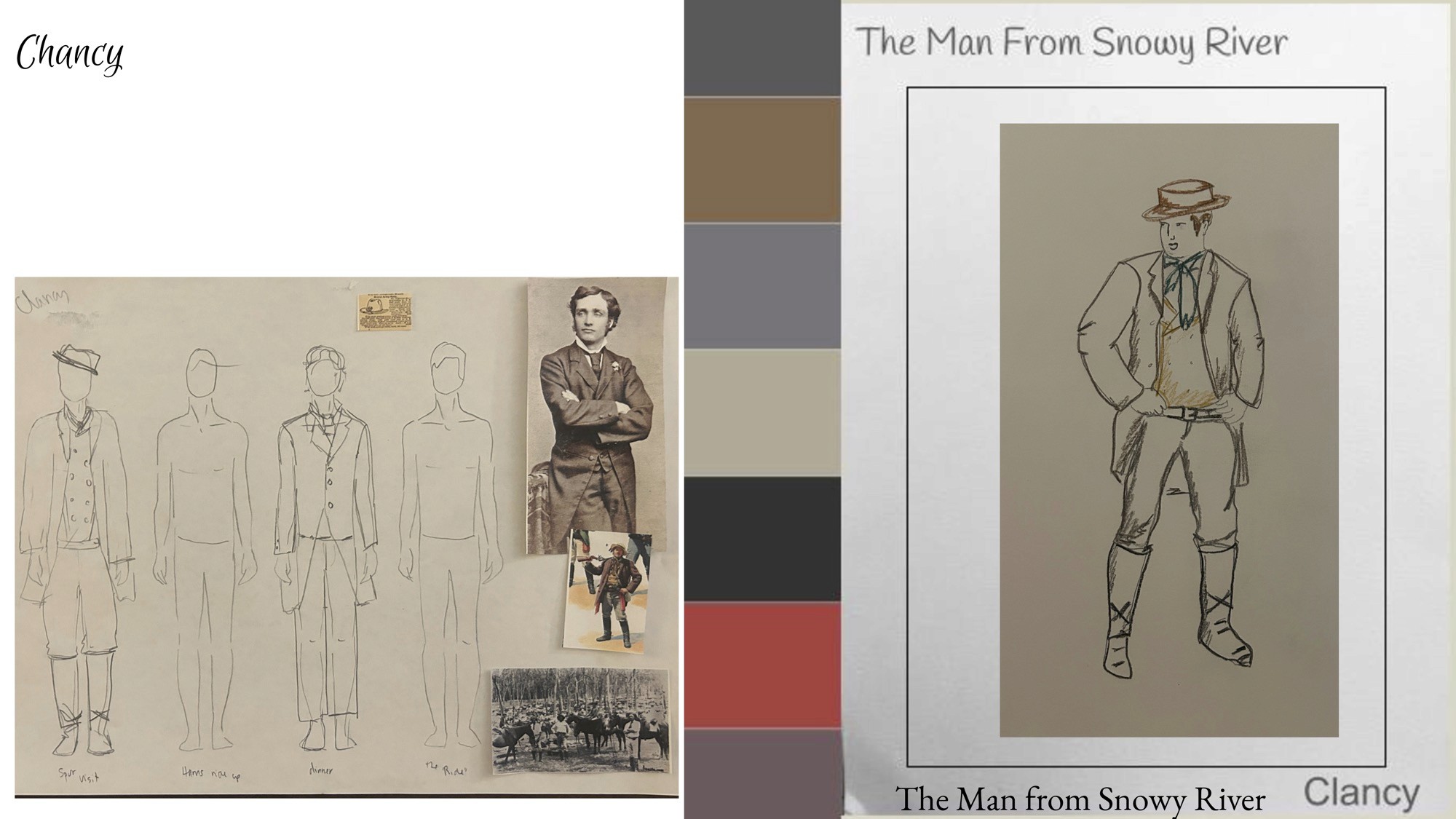 I researched and designed historically accurate costumes for a screen production of The Man From Snowy River. I provided research images with multiple sketched designs for all looks needed for the ten lead characters. I created a unique color palette for each character.