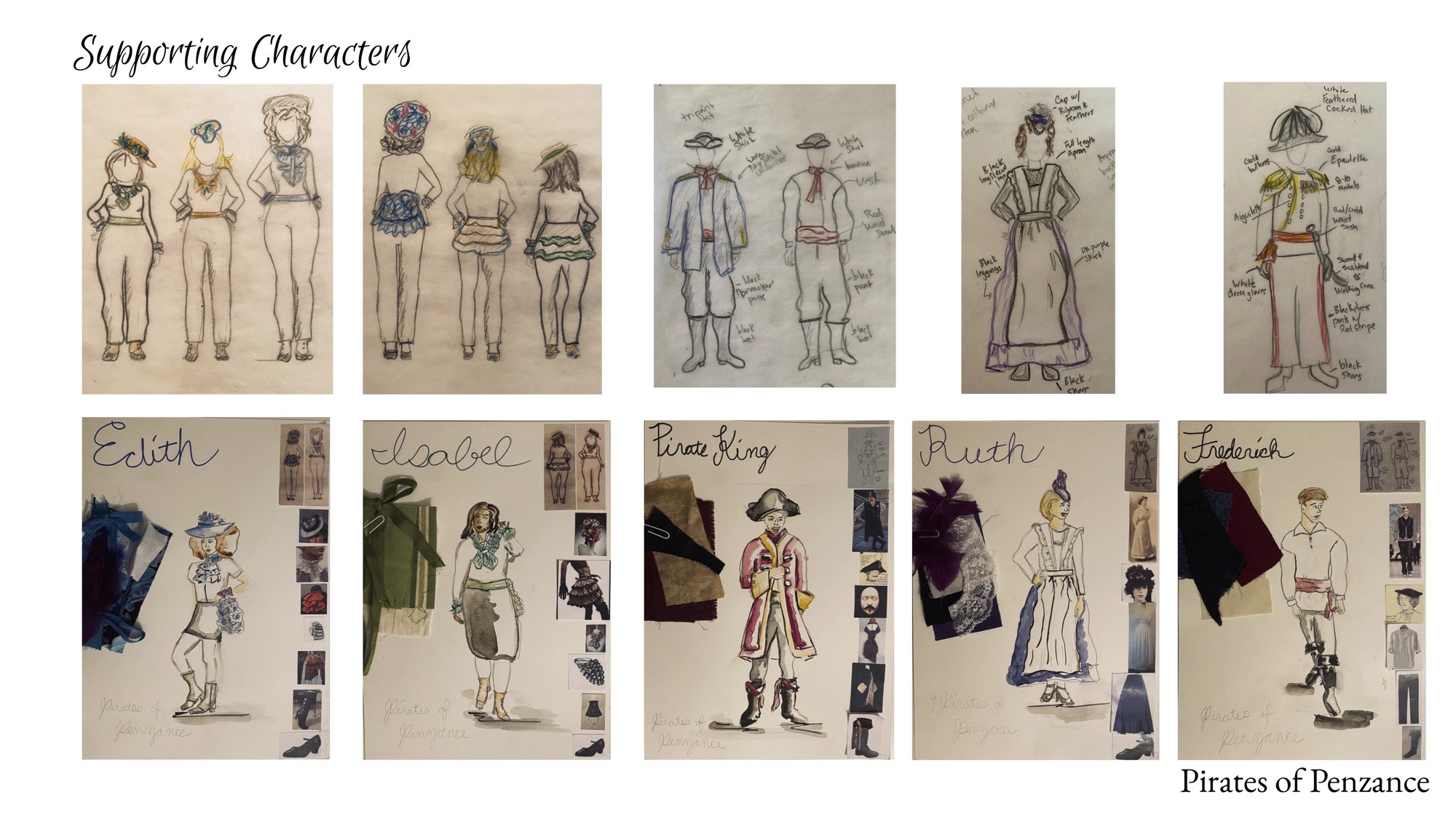 For this stage production of The Pirates of Penzance, I presented production research along with multiple design styles and options. I provided character research and boards, along with sketches and final renderings. I realized the main character's first look.
